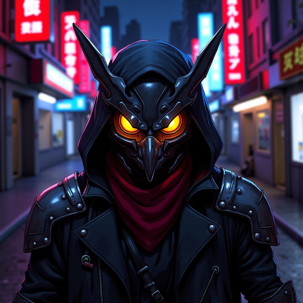 toriyama_style, 8k image a mysterious figure in an urban alleyway at night, wearing a sleek, metallic owl-shaped mask with glowing orange eyes. The mask is detailed, with sharp contours resembling the features of an owl's beak and horns, giving it a menacing, futuristic appearance. The figure is dressed in a black leather jacket with metallic shoulder pads and reinforced gloves, adding a robotic or armored aesthetic to the look. A deep red scarf is wrapped around the neck, providing a stark contrast against the dark tones of the outfit. The background consists of a dimly lit alley with neon signs glowing in red and blue, casting dramatic reflections and shadows on the wet pavement. The figure's hood is pulled over the head, partially obscuring the top of the mask, enhancing the sense of secrecy and danger. The lighting is soft yet sharp around the edges, emphasizing the glowing eyes and the metallic textures of the outfit. The overall mood is intense, evoking a sense of stealth, power, and readiness for action.anime shot,.RPG Style