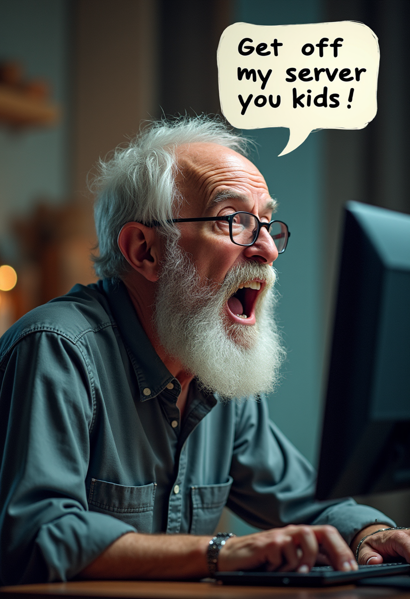 Old man screaming into his computer with a chat bubble saying "Get off my server you kids"