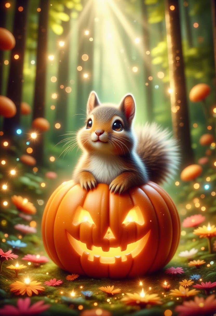 A cute squirrel dressed as a pumpkin, in a magical forest