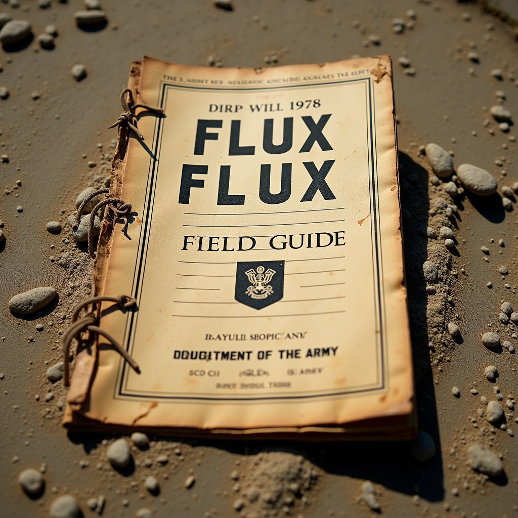 The image is a photograph featuring a military manual entitled "FM 21-76 Flux." The cover of the manual is positioned centrally and is a beige color, with the title "FLUX FIELD GUIDE" printed in bold, uppercase black letters across the middle. The book's title and author are outlined in black text, providing additional details such as "Department of the Army Headquarters Department of the Army, October 1950" and the emblem of the US Army in the lower center. The cover also features a grid of horizontal lines, adding a structured look to the manual, tattered and weathered, abandoned on a desolate post-apocalyptic street, partly covered in sand, bathed in chiaroscuro lighting, capturing a gritty, cinematic atmosphere, hyperrealistic masterpiece. Fallout