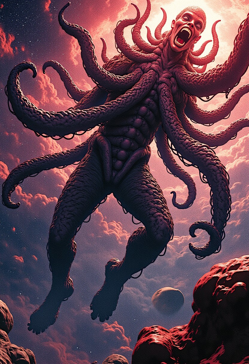 (masterpiece, best quality:1.2),photorealism,dynamic lighting,soft light,dramatic shot,volumetric lighting,(weightlessness:1.5),(deep space:1.5),(no planets, empty space:1.3),(Body horror:1.3), cosmic horror,(A big humanoid monster drifts in outer space:1.1), (its body is entangled with many giant tentacles:1.2), (meat growths grow out of it:1.1), (its body consists of a giant pulsating flesh:1.1),(cosmic background:1.2)