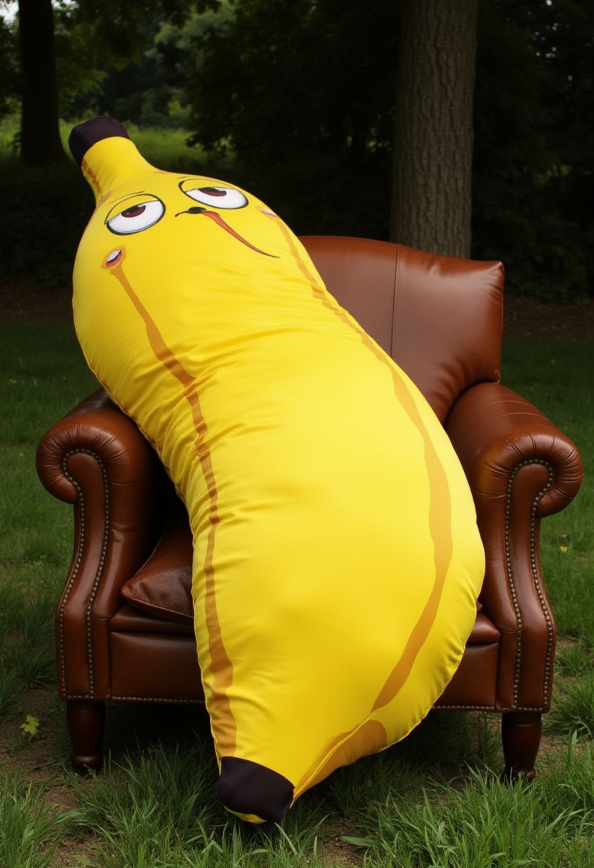 The image is a photograph featuring a yellow plush bodypillow in the shape of a banana, displayed across a brown leather armchair. The pillow is made of a soft fabric and has a stylized, cartoonish design. The armchair is surrounded by grass and trees, at an outdoor environment