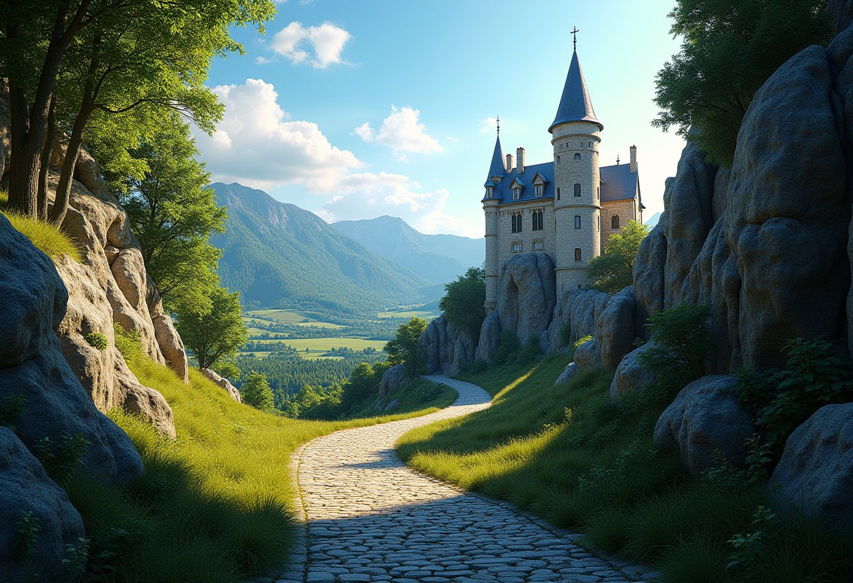 A narrow, well-worn cobblestone road winds down from the castle, leading off into the distance, disappearing out of the frame. This road serves as the primary entrance to the castle, blending naturally into the rocky terrain. The surrounding landscape features steep, rocky slopes in the foreground, transitioning into a vibrant green valley with rolling hills and dense forests. The trees and grass are lush, with the warm sunlight casting sharp, realistic shadows that enhance the depth and texture of the scene. The lighting is bright and natural, capturing the fine details of the castle's stonework, the leaves on the trees, and the textures of the ground. The sky is a clear, brilliant blue with a few scattered clouds, giving the scene a crisp, fresh atmosphere. The overall composition is sharp and precise, resembling a photograph taken with high-end professional equipment, with every element rendered in high definition to emphasize the realism of the scene. This is not a cartoon or stylized 2D/3D artwork, but rather a photographically accurate representation of a real-world setting. The image evokes a sense of awe at the natural beauty and human-made grandeur combined.```