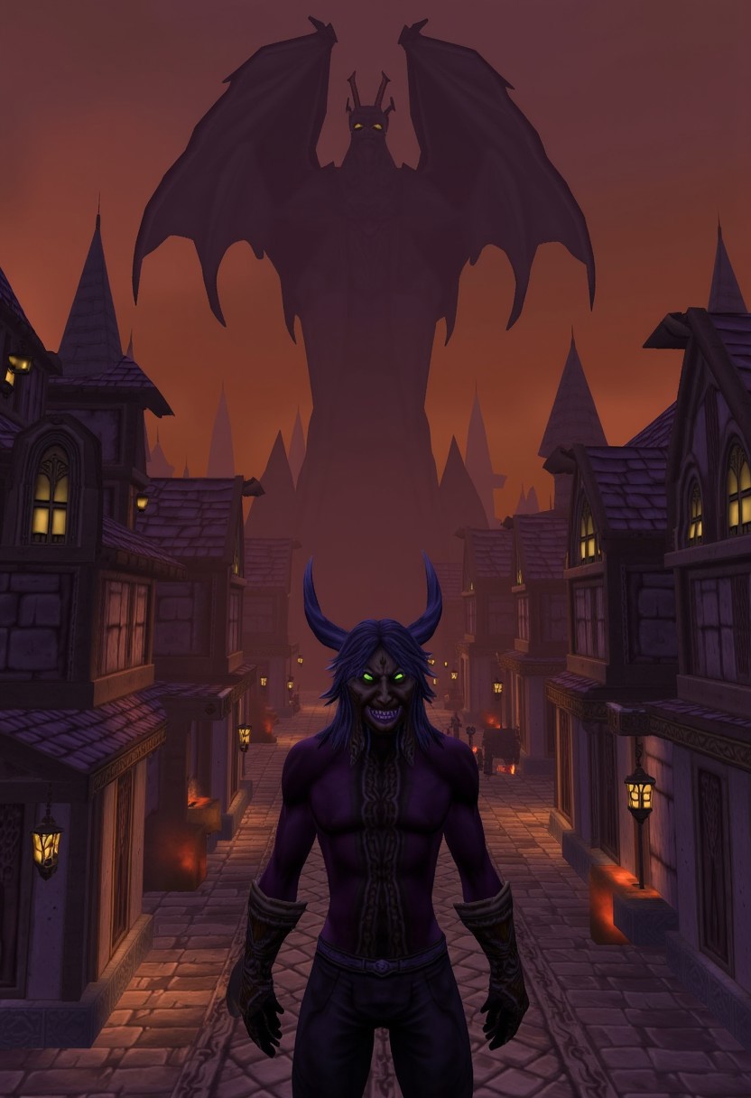 world of warcraft, ultrarealism, real life, Picture the dreadlord Mal’Ganis, towering over the crumbling streets of Stratholme, watching with cold satisfaction as Arthas begins the purge. His demonic wings are partially folded, his eyes glowing ominously as he smirks, knowing he has successfully pushed the young prince toward his inevitable downfall. In the distance, the burning city casts a sickly orange light over the scene, with villagers screaming and dying as Arthas' soldiers carry out his grim orders. Mal’Ganis, shrouded in shadow, blends into the darkness, an almost spectral figure in the chaos, watching the tragedy unfold with amusement.