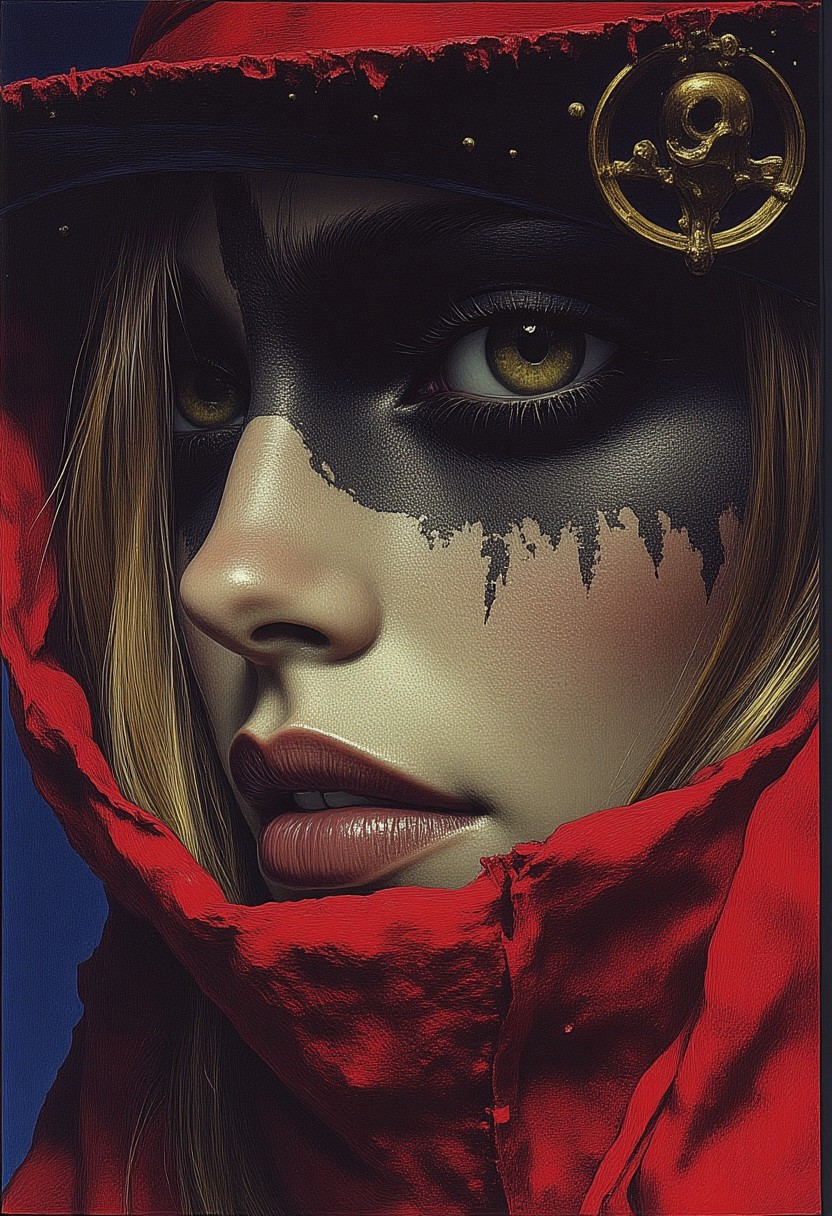 abstract photorealistic ink image in vivid, surreal colour glitch gradient, gold, red and blue colour scheme, a captivating female pirate, detailed hazel eyes, red lips, tricorne hat and bandana, long flowing blonde hair, night, chiascuro, directional light hitting one side of the face