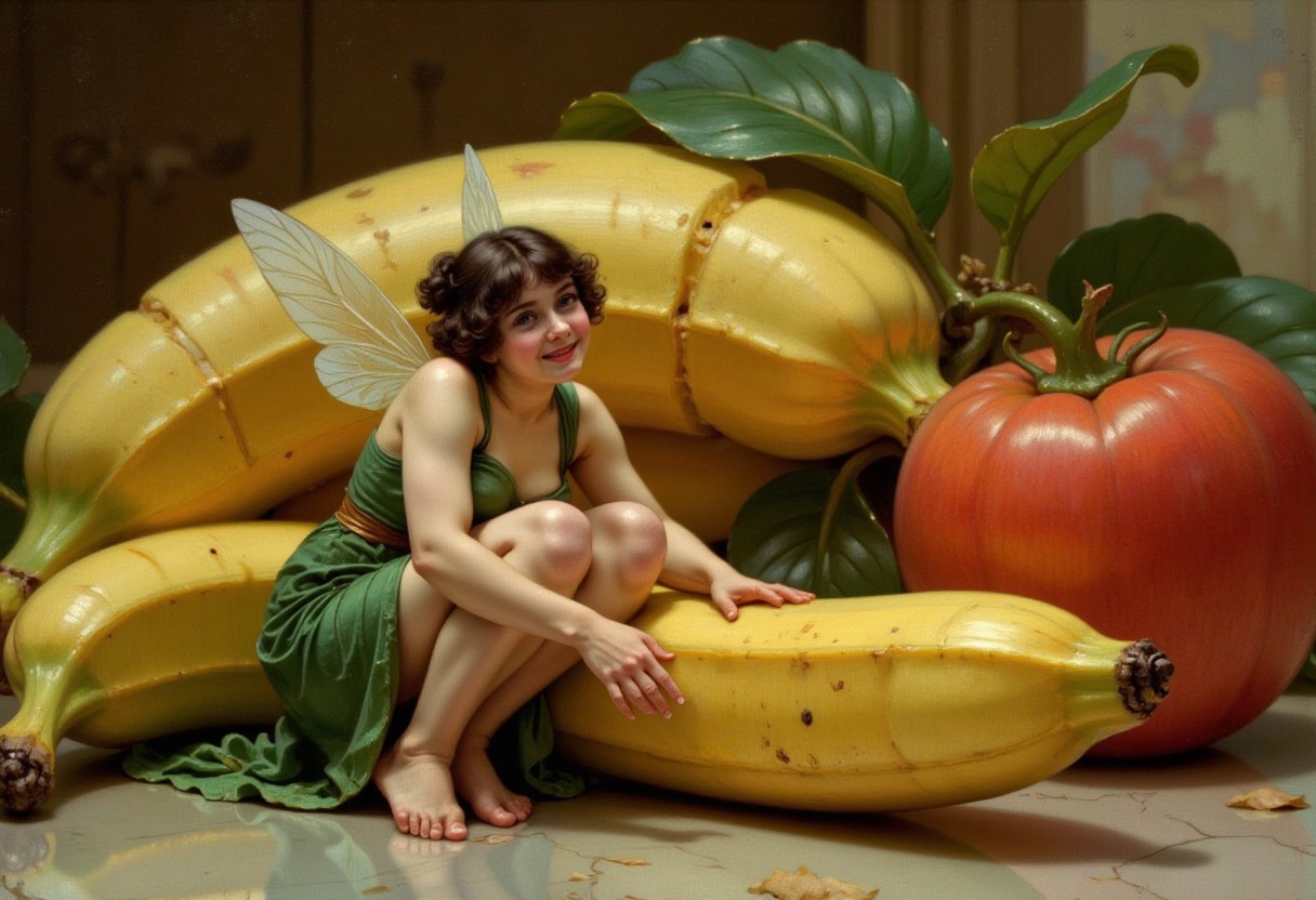 19th century Victorian oil painting by Ernest Normand of a tiny miniature 21 year old fairy woman, fairy wings, blue eyes, green dress, sexy, single hair bun, she is 1 inch tall tiny miniature woman posing next to a giant still life display of large fruit, TinkerWaifu, sitting on a banana, facing forward looking at the viewer with a slight smile on her face