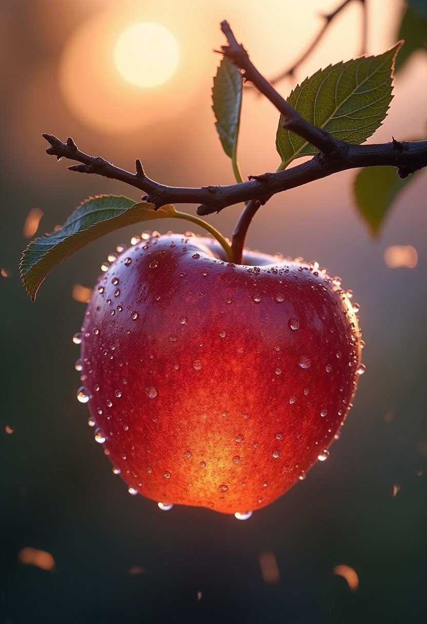 ((a delicate big apple)), made of diamond hung on branch in a beautiful dawn, in the background beautiful valleys, (Dew drops), divine iridescent glowing, opalescent textures, volumetric light, ethereal, sparkling, light inside body, bioluminescence, studio photo, highly detailed, sharp focus, photorealism, 8k, best quality, ultra detail:1.5, hyper detail, hdr, hyper detail, ((universe of stars inside the apple))