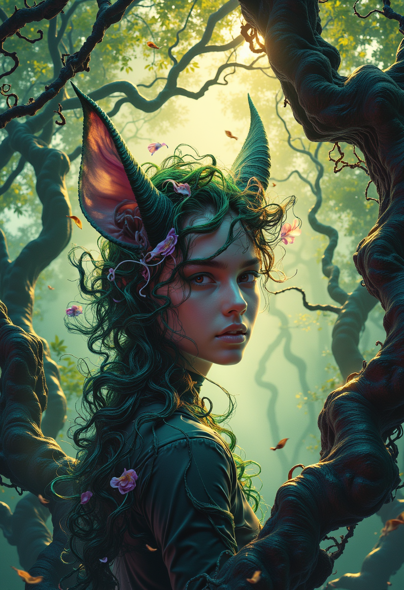 This is a highly detailed, digital illustration in a fantasy art style. The central figure is a forest animal. The background is a dense, lush forest, with large, twisted tree branches and thick vines crisscrossing the frame. The leaves are vibrant green, and light filters through the canopy, casting a mystical, dappled light on the scene. The overall color palette is dominated by greens, with subtle hints of brown and gold from the sunlight. The womanâs expression is serious and slightly melancholic, adding to the mystical and enchanting atmosphere of the illustration. The image exudes a sense of nature's power and the magical connection between the human and the forest.