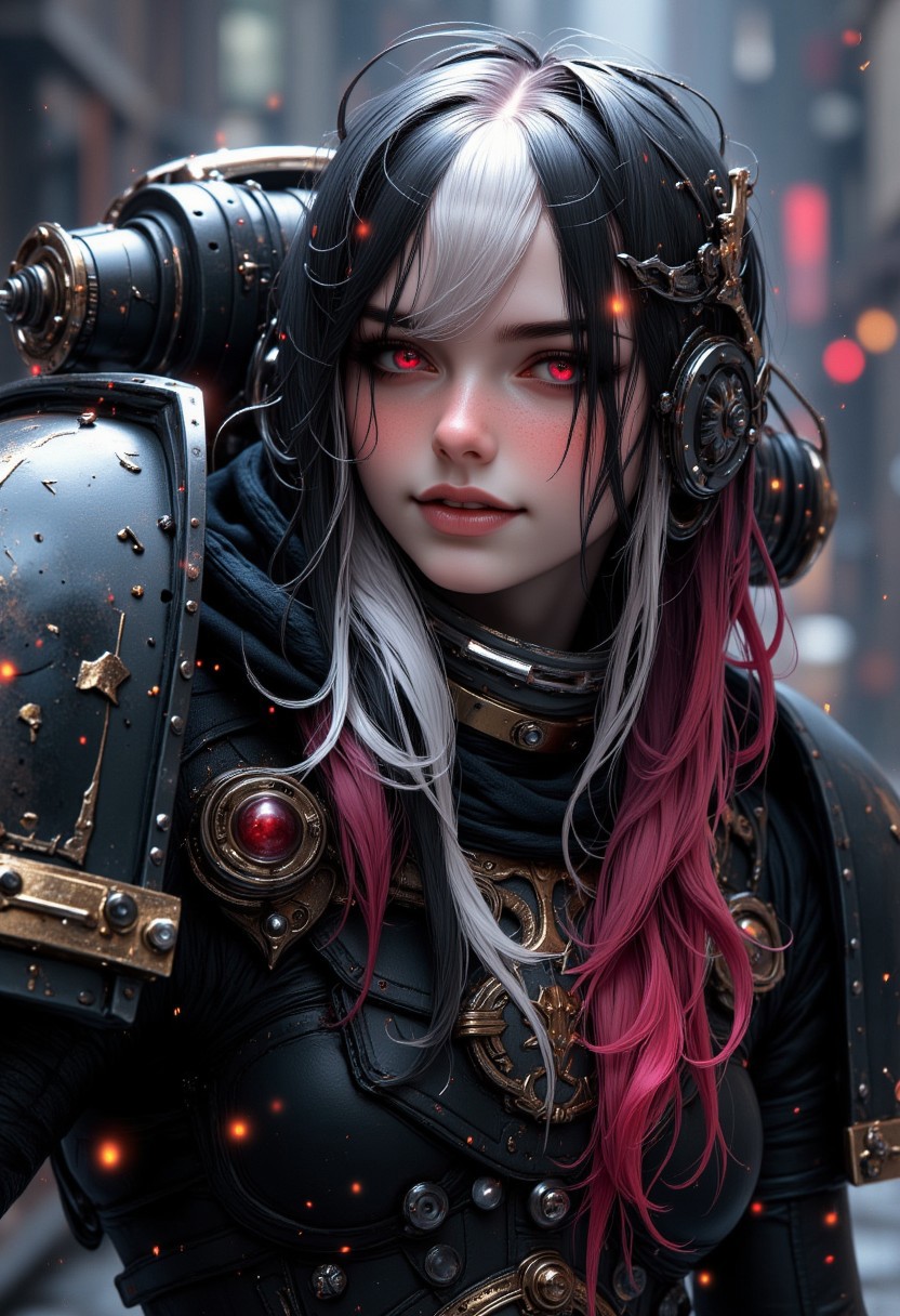 Fangs, black hair, multicolored hair, white hair, long hair, warhammer space marine, in power armor, red eyes, (full body), ultra realistic, delicate and smooth skin, blush, perfect body, thighs, highly detailed, glossy lips, Goth girl,