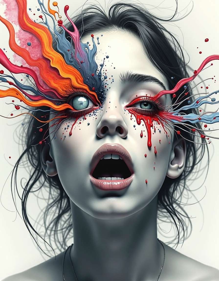 Abstract image of various emotions leaking out of a young woman's eyes and mouth and ears, expressed through a combination of abstract forms and hyperrealistic detail, Her eyes leak streams of liquid color, representing inner turmoil and pain, Her mouth emits tongues of fire that consume surrounding objects, Ears bleed rhythmic music that pulses through the image, Use a grayscale palette with occasional splashes of vibrant colors to represent the emotions, The overall composition should feel claustrophobic and overwhelming, as if the emotions are bursting from her skin, text, letters, numbers, , (&:0)
