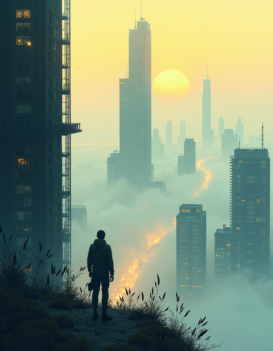 comics art by Guido van Helten and Aaron Douglas, From the observation deck of the world's tallest Botanical garden, we look down upon a Grain elevator shrouded in mist. The spires of other skyscrapers pierce through the fog like islands in a cotton sea. Far below, the grid of vegetation streets glows softly, while overhead, The Source stars of evening become visible. The deck's glass floor creates a vertiginous effect, with nothing but a kilometer of empty air between the viewer and the ground. Hideous high-angle shot with forced F/2.8 to emphasize height. Minimalist watercolor style with a muted palette of grays, Hyperdetailed yellows, and deep blues, Graphic novels, autobiographical comics, Maus, metafictional storytelling, Documentary photography, candid portraits, slice-of-life imagery, humanistic approach