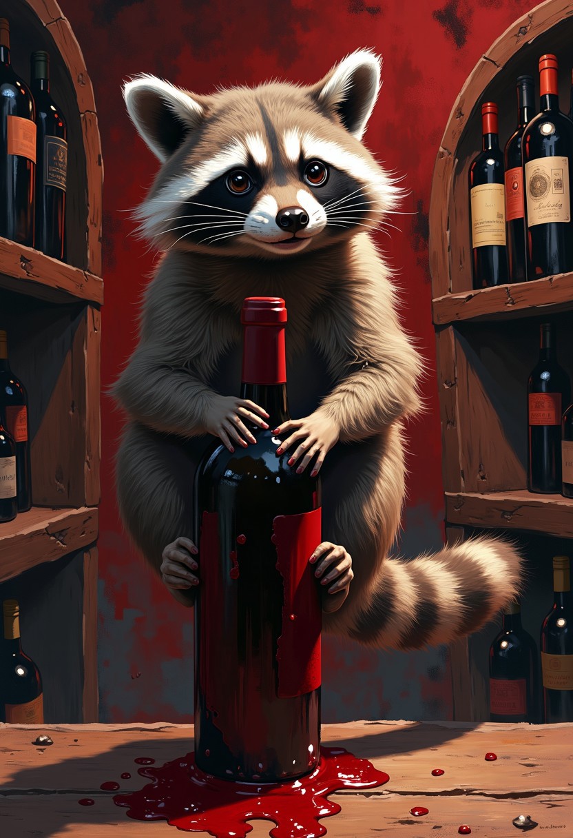 A drunk raccoon is riding on a bottle of red wine in a dimly lit wine cellar, dynamic, portrait, anime style oil painting