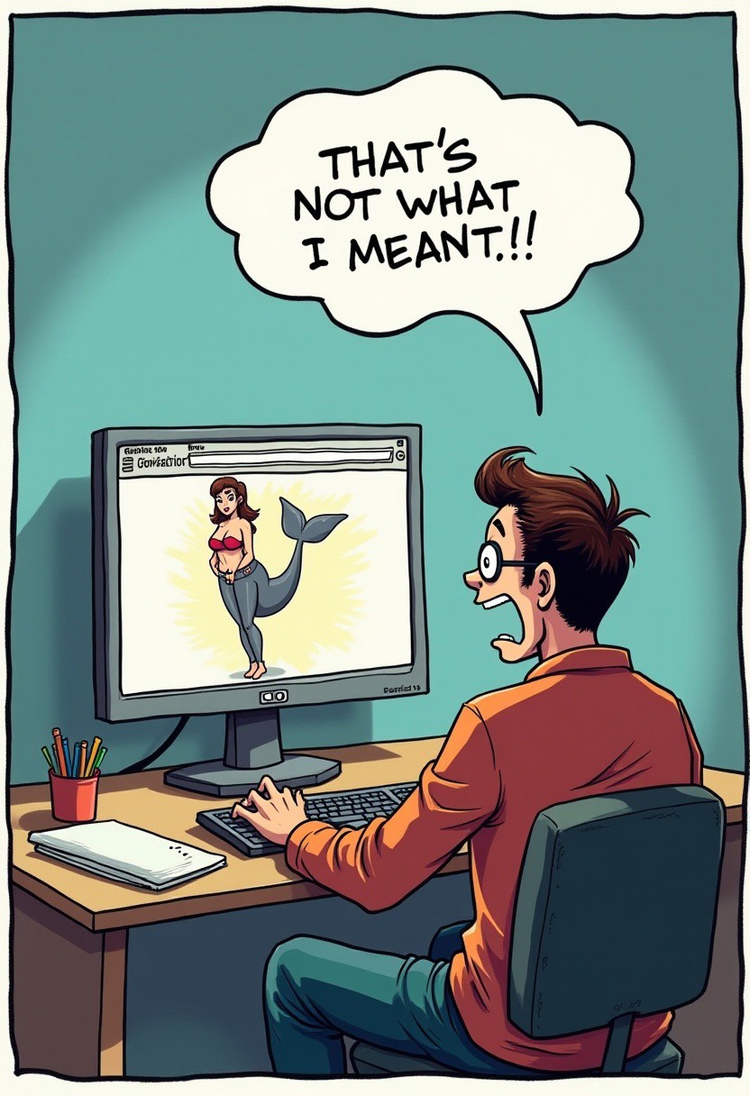 Comic strip style, farside Comic style, Single panel, A computer monitor on a desk, on the monitor is a website with a (banner) on it reading: "A.I art generator" under the banner is an image of a woman with a whale tail fish tail, on her lower body, A man sitting in front of the monitor angrily screaming in a speach bubble reading:"that's not what I meant!"
