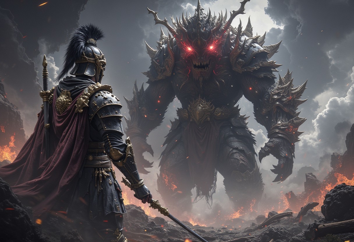 A Roman soldier-samurai hybrid stands ready for battle, viewed from behind. He wears a Roman helmet adorned with a horsehair plume, and his armor is that of a samurai, intricately detailed. In his hand, a spear gleams, poised for action. Before him, a monstrous titan looks, 20 times his size, with grotesque twisted limbs and glowing red eyes. The battlefield is a desolate wasteland, littered with broken weapons, bones, and fiery rain, under a dark, stormy sky filled with swirling clouds and distant lightning strikes.