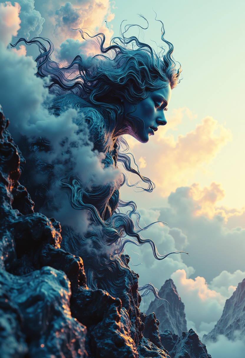 Impressionist digital sculpture of a wind shepherd, body forming from swirling air currents, herding clouds across mountain peaks, dynamic brushstrokes creating a sense of constant motion, cool blues and grays with warm sunlight breaking through