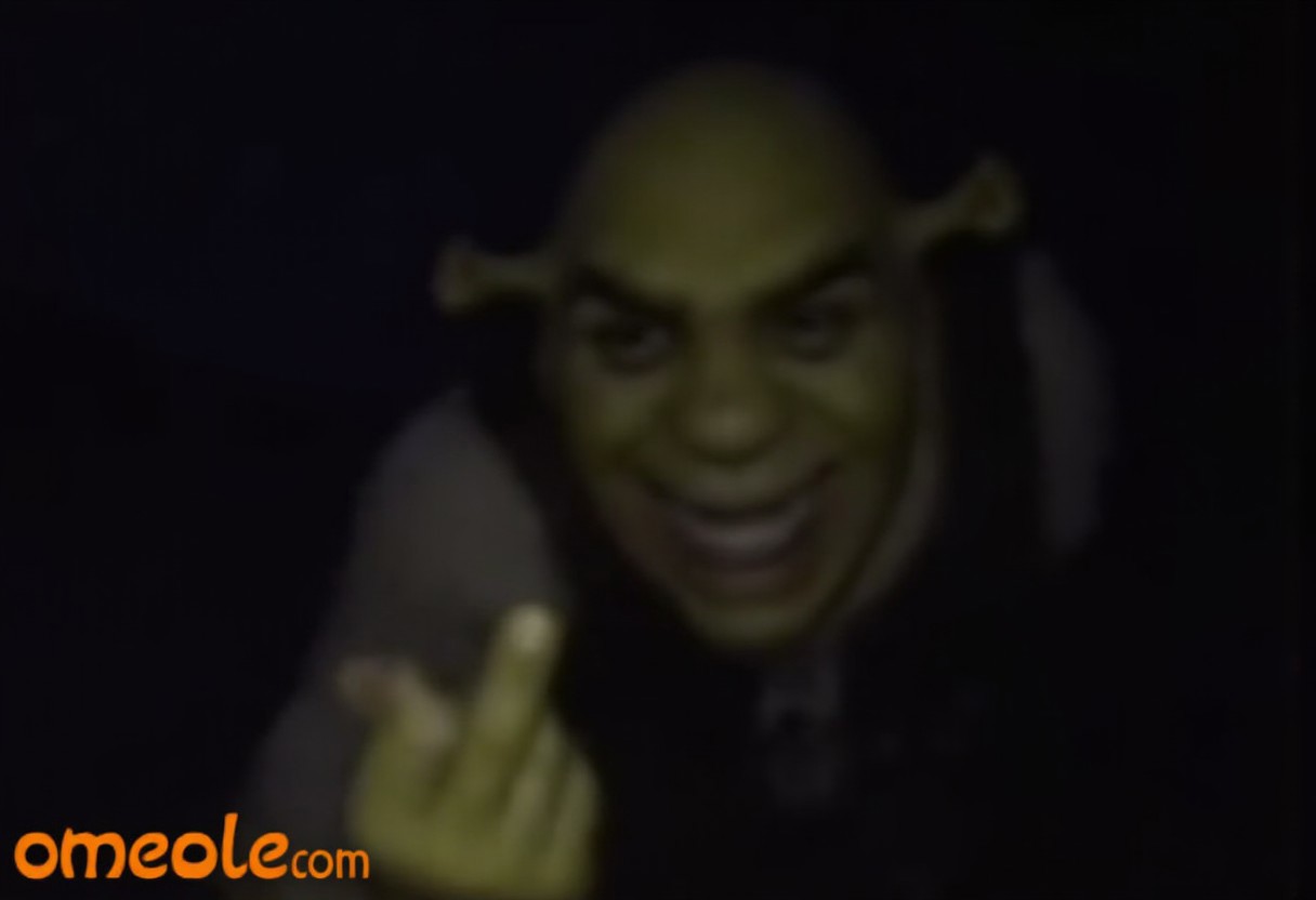 An omegle.com webcam taken at night of Shrek in a swamp smiling a very wide, creepy, and extremely uncanny smile. It is dark. Shark is not wearing a shirt middle finger to the camera <lora:lora09.TA_trained:1>