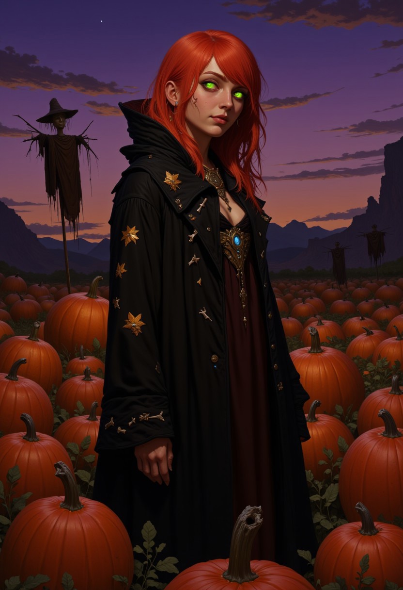 A portrait of a young human witch with vibrant red hair, standing in the middle of a pumpkin patch at twilight, her eyes glowing with green arcane light, a mischievous smile on her face, she wears a long black coat adorned with autumn leaves and small bones, pumpkins of all shapes and sizes around her seem to hum with quiet magic, the vibe is playful yet mysterious, the sky behind her is darkening with streaks of purple and orange, a scarecrow in the distance stands like a silent guardian.