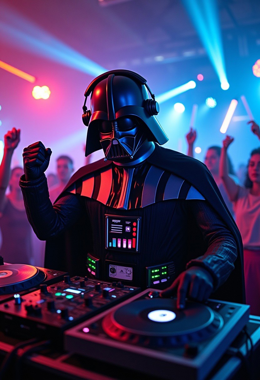 Darth Vader is a DJ. He’s wearing a set of studio monitors and scratching records on a turntable The lighting is dim. There are strobe lights, lasers, a smoke machine, and neon lights in the background. People on the dance floor holding glow sticks have their hands in the air. He’s also pumping his fist.