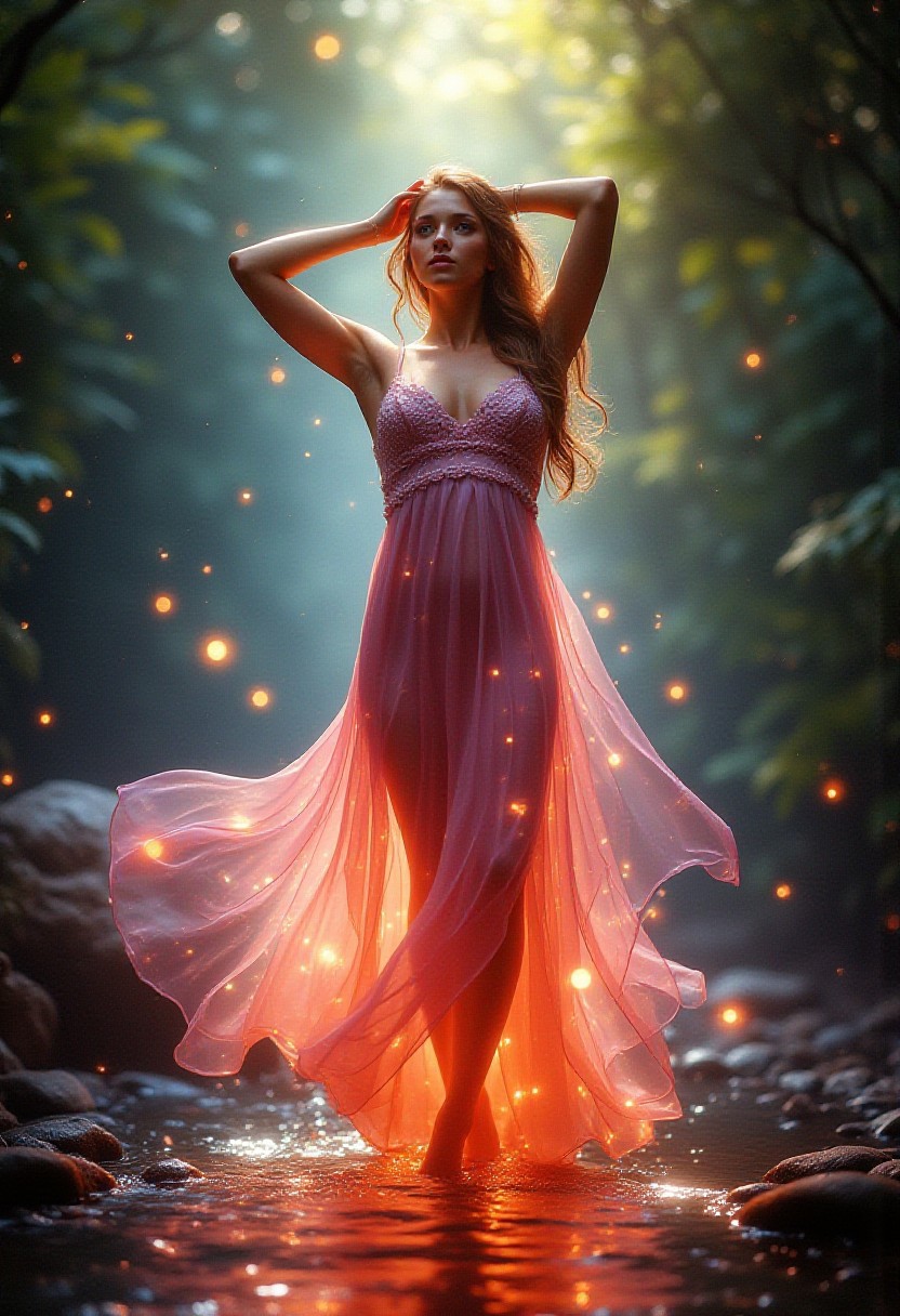 Abstract Lighting Effects, Midjourney style, Photorealism, Cinematic style, high fidelity, realism, chiaroscuro, play of shadow and light, rays of light. A whimsical fantasy scene featuring a slightly tanned beautiful brazillian woman in a flowing, radiant satin dress with intricate patterns. The vibrant colors and glowing fabric are enhanced by soft, magical lighting, creating an ultra-quality, dynamic composition. Whispering Winds, The suggestion of whispering winds, creating gentle ripples in the girl’s dress and hair. A path of luminous stones leading through the scene, guiding the viewer’s eye.Soft, translucent curtains of light gently swaying in the breeze, framing the girl in a magical glow.Soft, flowing ribbons of light or fabric moving gently in the air, adding a dynamic, whimsical touch.A crystal-clear stream reflecting the vibrant colors and glowing lights of the scene.Soft, radiant auras around objects in the scene, enhancing the magical, otherworldly feel. The woman stands with both arms raised above her head, slightly leaning back as if reaching for the sky, her dress flowing downward.