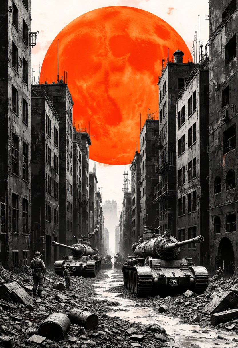 A graphic illustration, in black and white, of a city landscape with a bright orange sunset, Japanese infantry with Type 95 Ha-Go tanks in the city ruins <lora:Dieselcore:0.7> d1eselc0re <lora:Glitchcore_Flux:0.4> gl1tchc0re