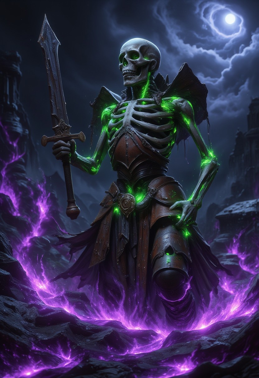 A highly detailed skeleton warrior rises from a cracked grave, holding a rusty sword in one bony hand, with tattered, weathered armor hanging loosely from its frame. The scene is shrouded in eerie purple and green mist, with a dark, stormy sky in the background. Glowing green light emits from the warrior’s eye sockets, and cracks of the earth around the grave are lit with otherworldly purple energy. The scene is semi-realistic, with gritty textures on the rusted metal, bone, and dirt, giving it an epic, haunting feel, 4k, highly detailed background.