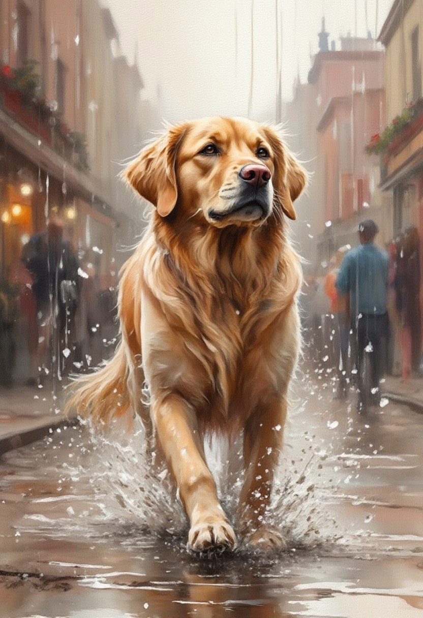 watercolor, wet on wet, paintstreaks, watercolor painting, a golden retriever in the rain a painting in the style of Eugen Chisnicean
