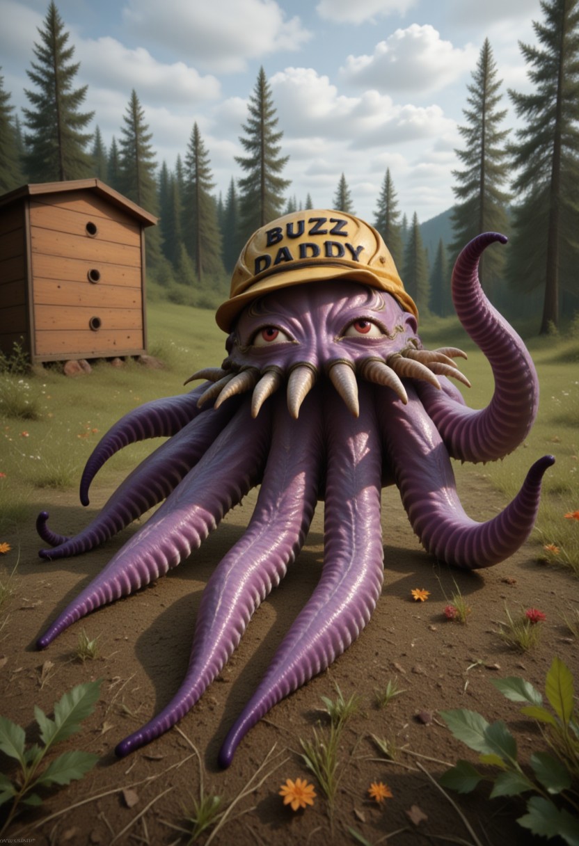 Photograph of a creature named Ultros, purple octopus with 8 tentacles, wearing a bee costume, next to a beehive outside, with a hat that says "BUZZ DADDY" with a lightning bolt on it.