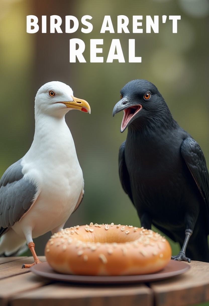 A dramatic close-up render of a seagull and crow gasping with surprise looking at the viewer while standing by a bagel on a outdoor dining table. Everyone knows birds are a government construct used to spy on their own citizens. The words "BIRDS AREN'T REAL" is written in ArtDecoFont across the top <lora:Art_Deco_Font:1>, propaganda poster