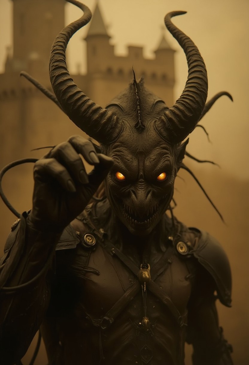 Close-up portrait photography of a cyborg demon macro, breathtaking bright darkness, reflecting the essence of a cyborg demon - in a fighting stance, in front of the castle, ethereal, smoky background. casting translucent amber-black color, atmospheric haze, film grain, cinematic film frame, shallow depth of field, highly detailed, high budget, cinemascope, moody, epic, general detail, gorgeous, vintage 2000s RAW photo, photorealistic, hidden camera, cinematic color grading, eye highlights, atmospheric lighting, skin pores, imperfections, natural, fine sharpening,