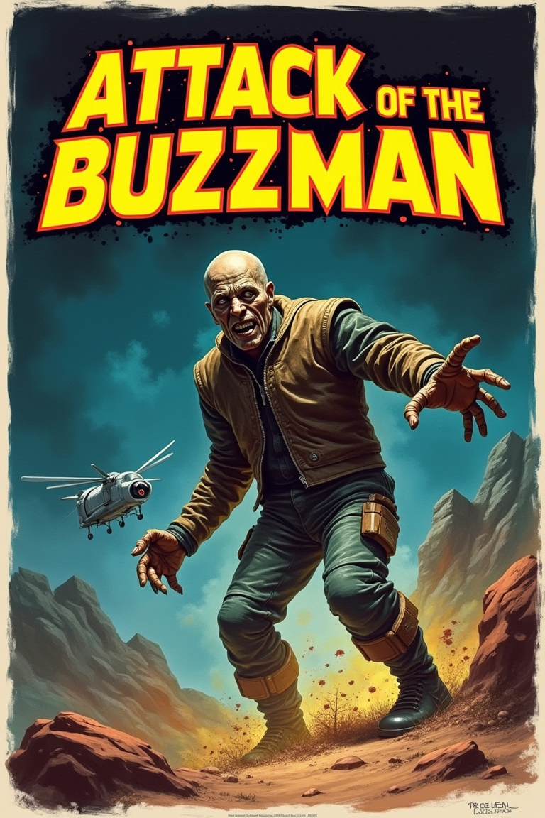 sci-fi fantasy movie poster, big title text says "Attack of the Buzzman" in sixties movies font style. Sixties horror moview style. Buzzman is the main character.