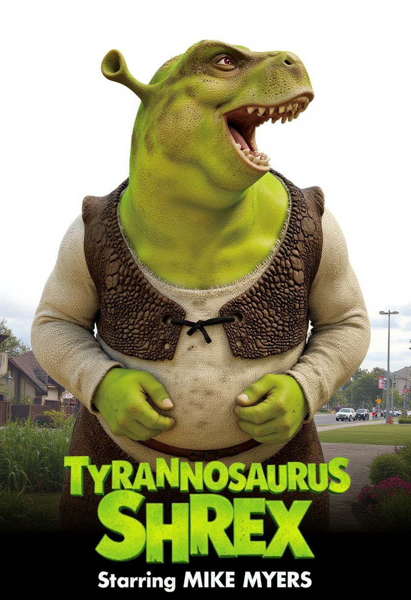 A movie poster titled "Tyrannosaurus Shrex" On the poster, a dinosaur with Shrek's head stands in the foreground roars loudly evoking images from Jurassic Park, but also comedy due to Shrek's head. On the bottom of the poster it says "Starring Mike Myers"