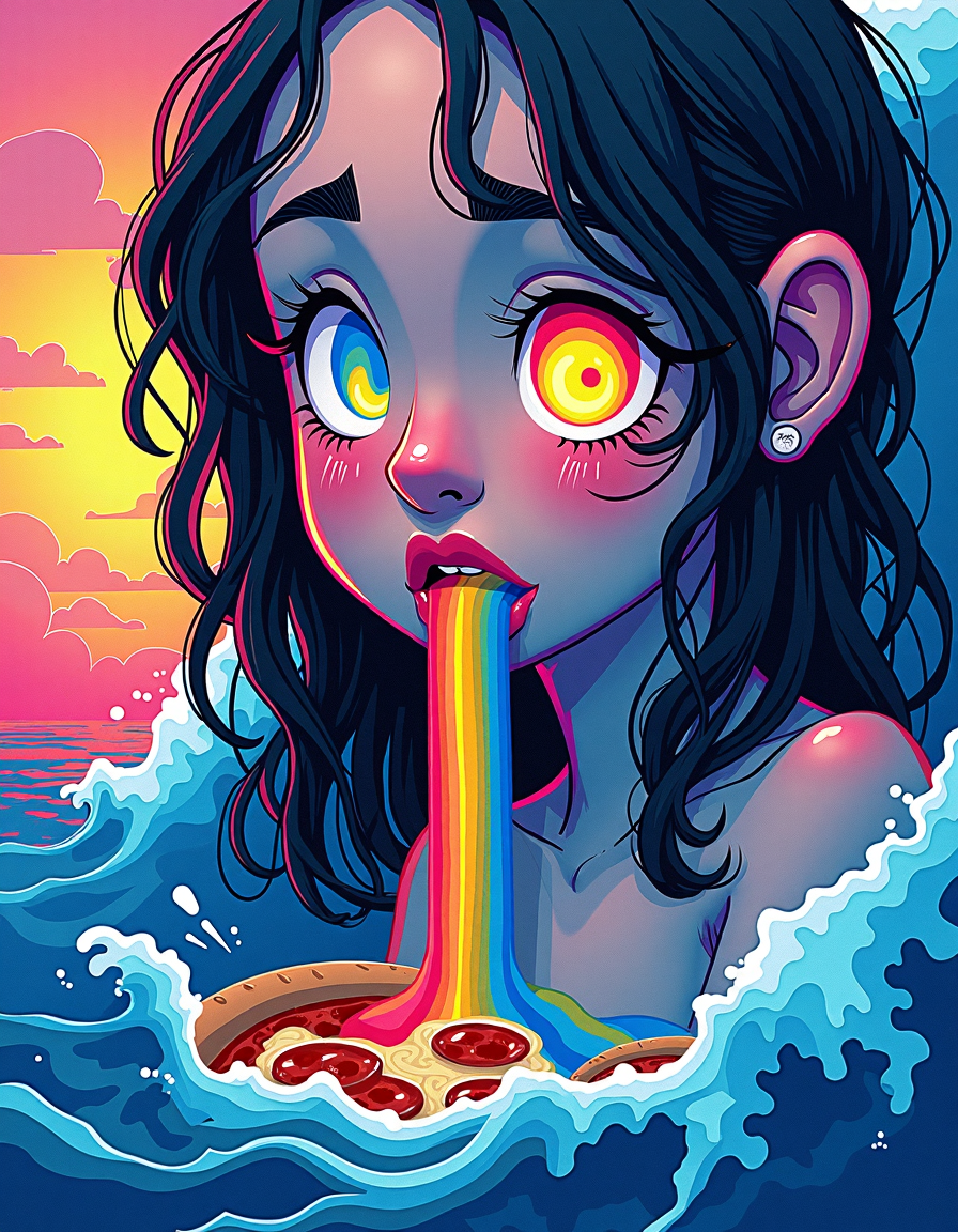 An abstract image of various emotions leaking out of a young woman's eyes, mouth, and ears, Use vibrant colors like electric pink, deep blue, and glowing yellow to represent the different emotions â anger, sadness, joy, and confusion, The emotions should seem to be oozing from her body, mixing and blending in unusual ways, Use food imagery to suggest specific feelings, such as a slice of pizza for anger or a bright, colorful rainbow for joy, The background can be a stormy ocean wave with distorted waves suggesting chaos, Employ techniques like glitch art and pixel art to create a sense of distortion and disorientation, reflecting the chaotic nature of emotions, , (&:0)