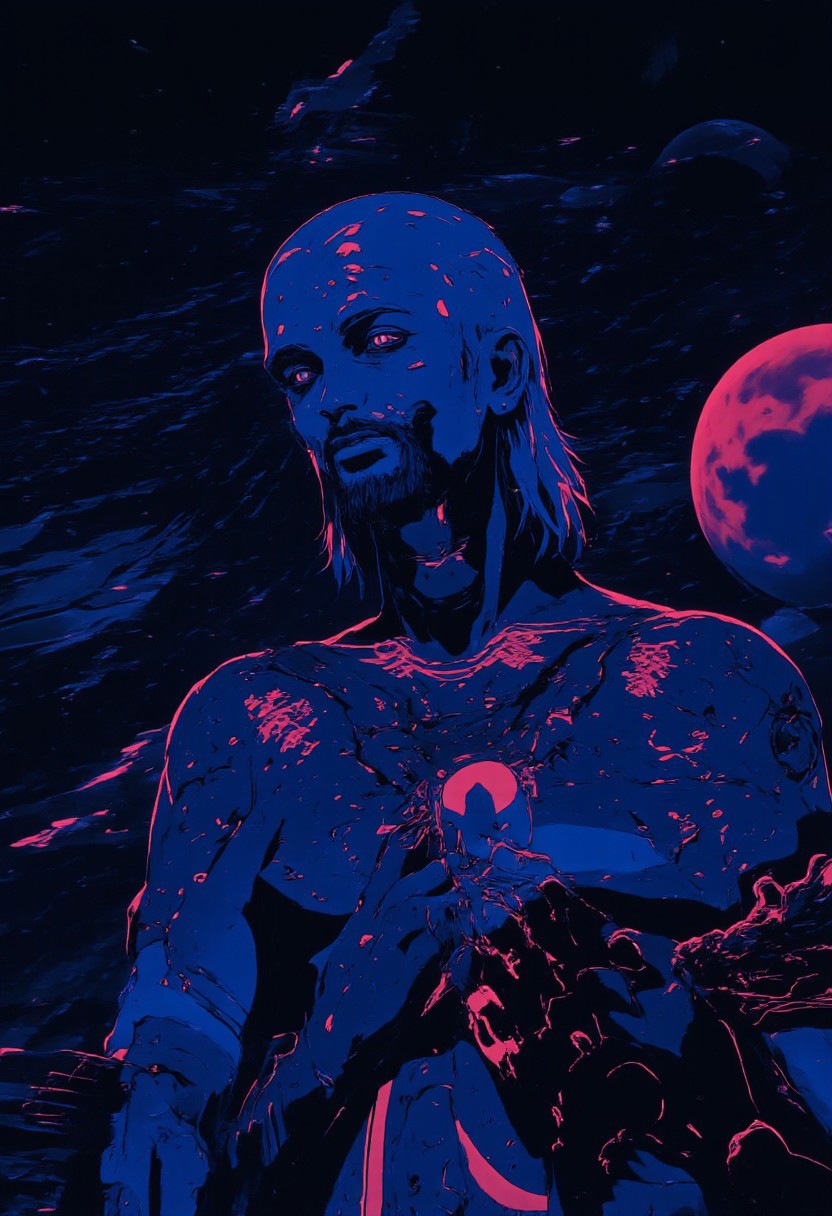 Low-angle **anime cyberpunk style ((Detailed hand, Hand, Perfect hand, vantablack, anime, cyberpunk, ne0nfant4sy))** digital art, towering over the viewer, holding his trident** with immense power. His **face and body**, from his **jata hairstyle** with the river** flowing through it to his **muscular and lean ascetic physique**, are intricately drawn using **dots and lines** in the colors **sky blue**, **neon blue**, and **black** (in that order of preference and quantity). His **blue glows faintly, while the **third eye** on his forehead pulses with cosmic energy. His **serene yet powerful expression** gazes down on the viewer, with a sense of both **creation and destruction** in his calm demeanor. The **dark sky** in the background is filled with **planets** and the **solar system**, reinforcing his **cosmic control**. The intricate use of **sky blue** and **neon blue** brings his divine power to life, contrasting against the dark background, as if he is the guiding light in the vast universe.