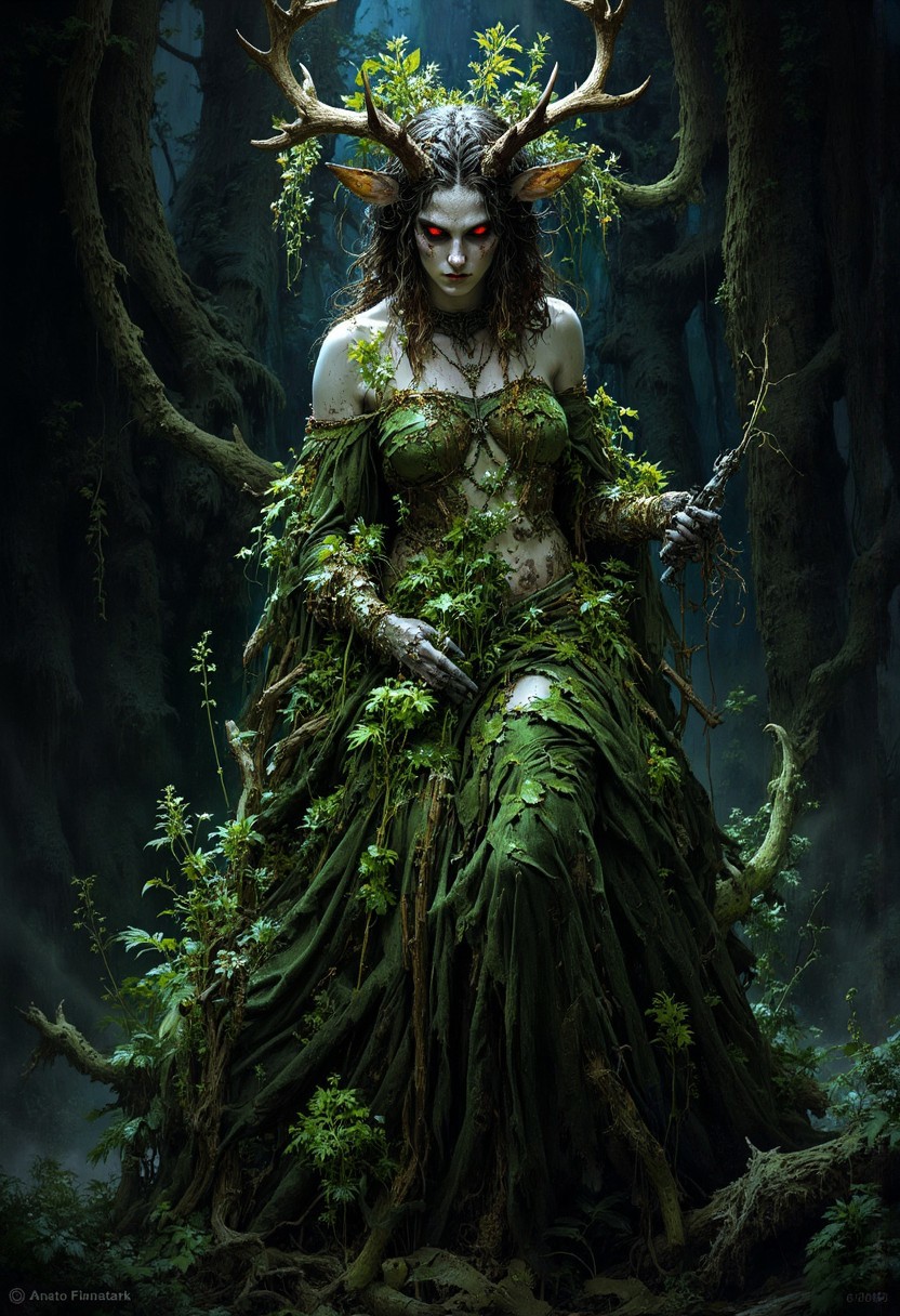 An evocative dark fantasy illustration by Anato Finnstark and Greg Rutkowski. The central figure is a once-elegant forest nymph, now corrupted by sinister forces. She has deer-like attributes, a pale complexion, glowing red eyes, and jagged antlers. Her once-lush attire is now tattered and overgrown with the very greenery that she once represented. The background is dark and foreboding, reflecting the nymph's lost beauty and anger. The overall atmosphere is cinematic and conceptual, immersing the viewer in a world of dark fantasy., cinematic, conceptual art, dark fantasy