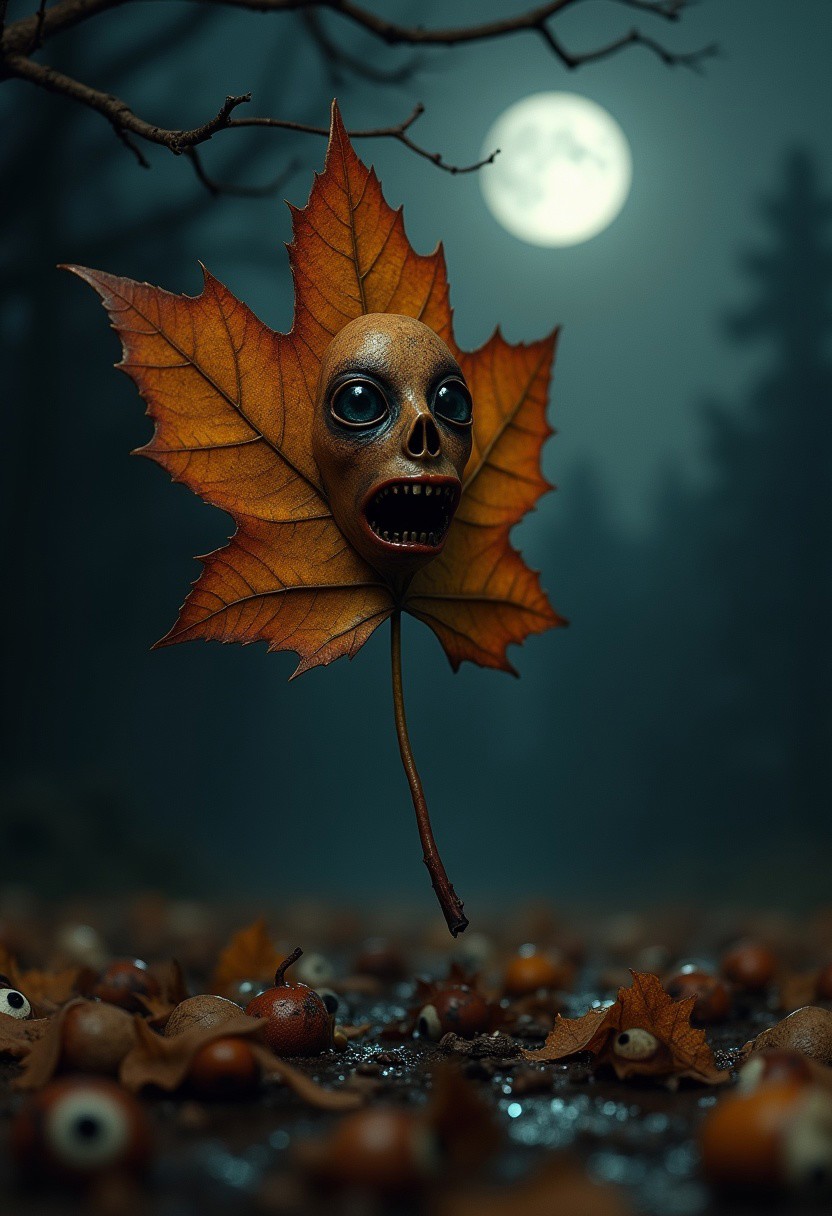 UHD 32k dark comedy movie still, photograph, closeup portrait of surreal dark shadowed anthropomorphic autumn leaf with eyes and mouths crying dangling from a branch looking sick, below on the ground there are many brown leaves on the ground with dead eyes, night solely lit by eerie light from one full moon, very detailed and photorealistic, shadows, gritty texture.