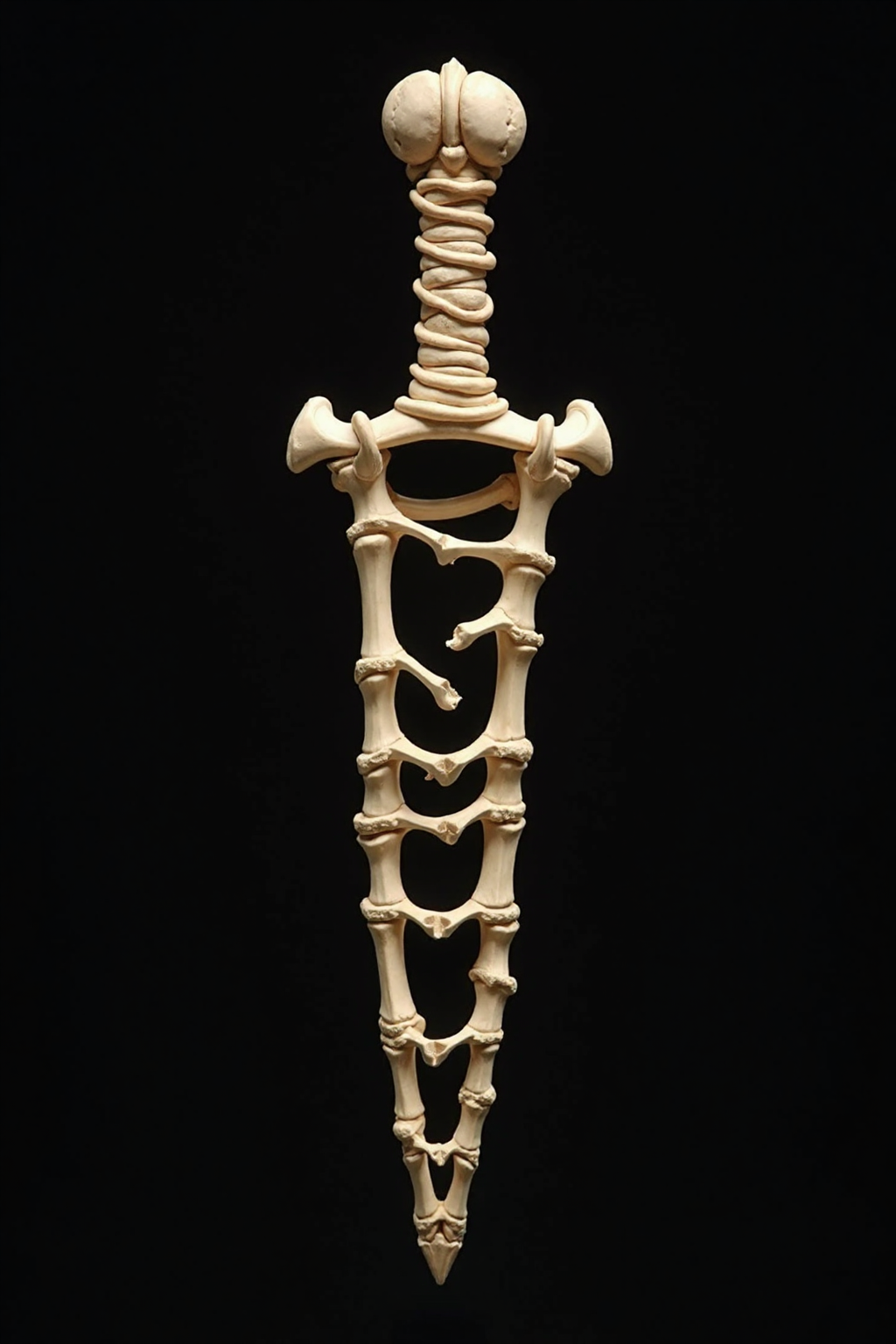 In the dim light (dagger) made entirely from rib-like bones appears unnervingly delicate. The hollow frame exposes the empty, fragile void inside, as if the structure is barely holding together. Thin (dagger) pale bones wrap around the edges, and the entire dagger seems to exude a sense of decay, fragile and ready to collapse at any moment.