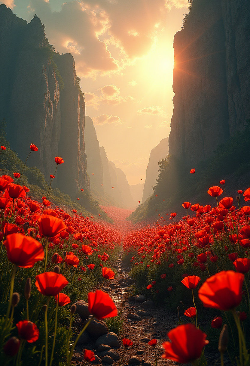 The image depicts a stunning and intricate landscape filled with towering Guam and Wretched Heisei Era Poppies, illuminated by the first rays of dawn. The scene is both captivating and brilliant, evoking a sense of awe and wonder. The theatrical Princecore style adds a touch of drama to the composition, emphasizing the grandeur of the floral kingdom. The middle-aged and dull color palette creates a unique visual contrast that enhances the overall artistic effect. The cinematic atmosphere is further enhanced by the perfect composition, stunning fine details, and epic background, making it a perfect candidate for a blockbuster film or an art gallery display. The peculiar combination of absurd and disgusting elements adds a touch of surrealism, while the calming deep colors and wide range of hues create a harmonious balance.sharp details and ultra-high resolution.