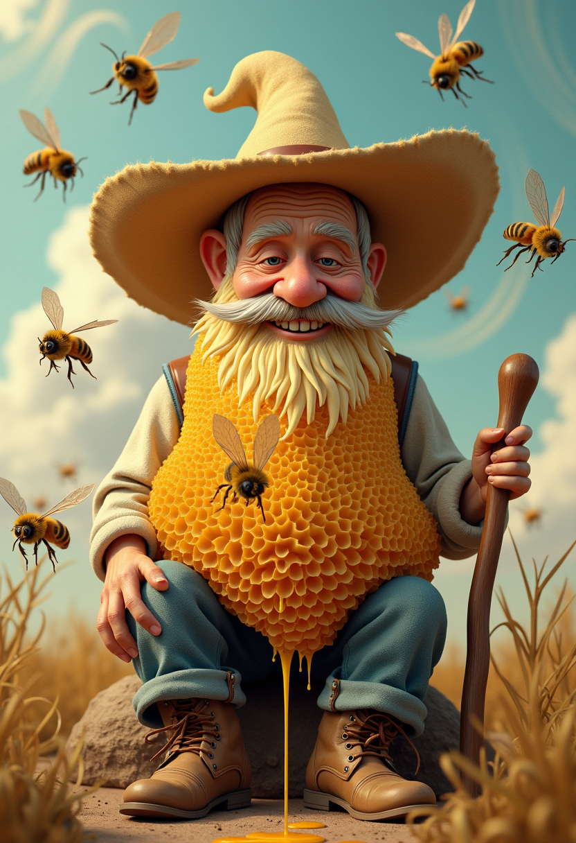 zavy-drkcnmtc, masterpiece, high detail, analog, hyperrealistic, whimsical and surreal scene featuring an elderly man with a gentle smile, wearing a wide-brimmed straw hat. His beard is made entirely of dripping golden honeycombs, from which honey flows. Bees hover around him, some landing on the honeycomb beard, giving the impression that they are hard at work. The man is seated in a relaxed pose, wearing casual overalls and rustic brown boots, while holding a small wooden staff by his side. The background is a soft, cloudy sky with swirling patterns that evoke a light, dreamlike atmosphere. <lora:flux_vividizer.safetensors:0.5:1.0> <lora:aidma-Image Upgrader-v0.1.safetensors:1.0:1.0> <lora:FluxDFaeTasticDetails.safetensors:1.0:1.0> <lora:zavy-drkcnmtc-flx-v2.safetensors:0.8:1.0>