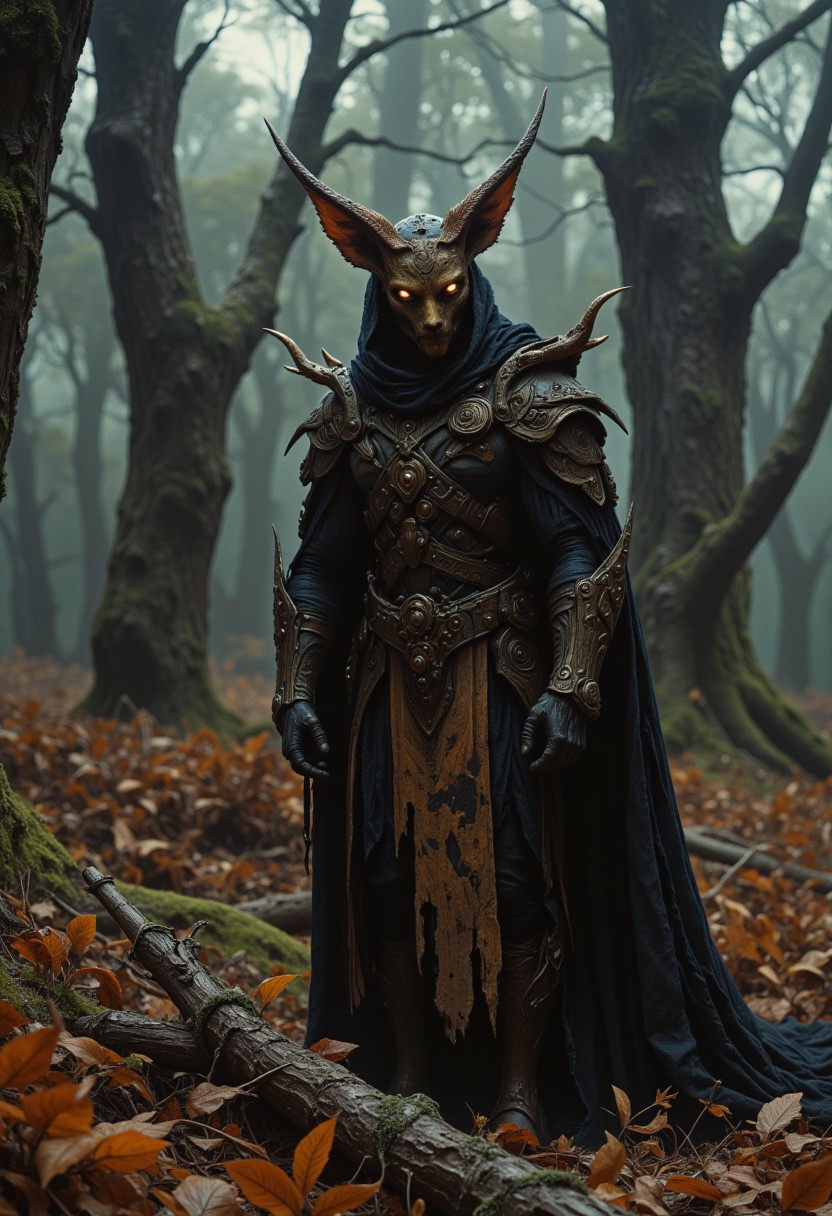 Slagar the Cruel: Scene of a fox with patches of fur transitioning into decayed leaves, wearing a mask with elongated features and deep-set glowing eyes. He stands at the edge of an autumnal forest, mist swirling around, enhancing his sinister presence. , live action, in the style of an old 80's VHS dark fantasy, VHS screen grab, grainy, old footage, in the style of an old 80's VHS dark fantasy, VHS screen grab, grainy, old footage