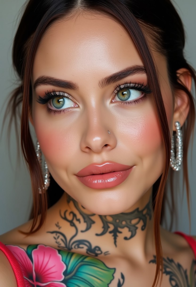 TOKjennyblancoxzt/83 Hyperrealism, extreme close-up Portrait of a beautiful, stunning unique female character. She has large turquoise eyes filled with joy and excitement, extravagant eyelashes, making this image a masterpiece of photography and digital art. Style: realistic hyper-detailed rendering, 32k UHD, expressive eyes, punk, graphic design, pink hibiscus tattoo, girl's face, side view, pretty and cute, gleaming lips, white skin, telling a tale of adventure. Exuding confidence and serenity. Vibrant tattoos adorn her sun-kissed skin
