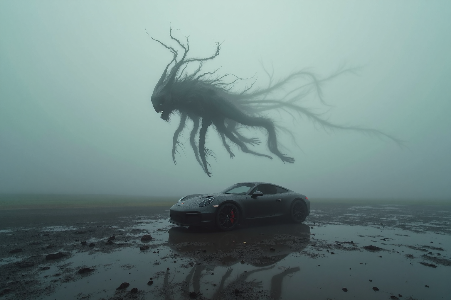 misty abandoned place in the middle of nowhere,a wet dirty sport car on a sleeky wet muddy surface, ((flying evil, creature with strange abstract soft futuristic shapes, floating evil entity creature above the car)), haunted thought-provoking calm composition of strange and calm, moody stormy background, slate grey depth of field by alessio albi