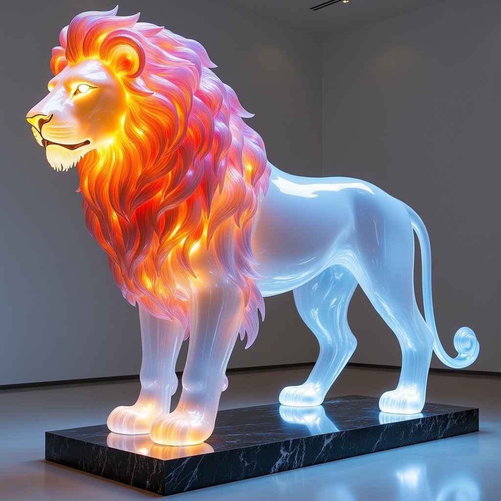 The image is a photograph of a striking, large-scale glass sculpture of a lion displayed in a modern art gallery. The lion is made entirely of clear, reflective glass, with its body segmented into three distinct sections: the head and mane, the body, and the tail. The mane and head glow with vibrant, iridescent colors, transitioning from a fiery orange at the base to a deep red and finally to a cool blue at the top, creating a gradient effect. The body and tail maintain a more translucent, clear appearance, allowing the viewer to see the floor and wall reflections through them. The lion's form is sleek and stylized, with exaggerated, smooth curves and a stylized, elongated tail. The sculpture stands on a polished, black marble pedestal with subtle, reflective patterns, which enhances the overall glossy appearance of the piece. The background is a plain, light gray wall, and the floor is a smooth, light-colored material that reflects the sculpture's colors, contributing to the immersive, glowing effect.
