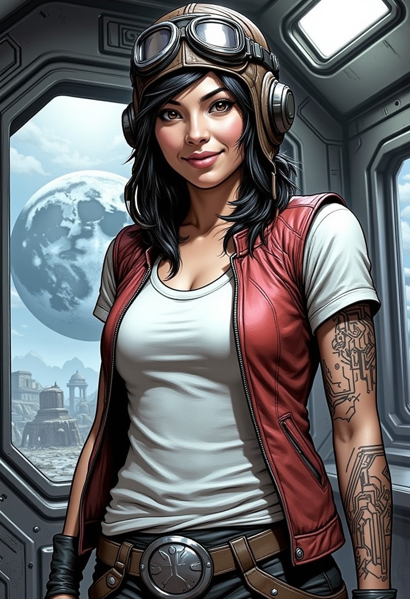 hyp3rd3tail style painting of a young Asian woman wearing white t-shirt with red vest, aviator helmet with goggles, leather pants and belt, medium length black hair, circuitry lines tattooed on one of her arms , background is on a space station with a window in background overlooking an alien moon
