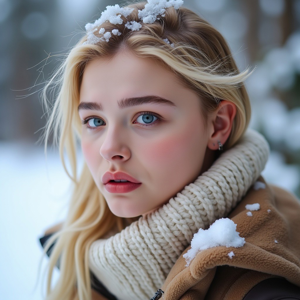 Photograph, ChloeMoretzflux1a She has a fair complexion and blonde hair that is tied back, with a few loose strands framing her face . Her lips are full and slightly parted, with a natural, subtle pink color. wearing winter clothes, snow is accumulating on her hair, shoulders and clothes, Dynamic pose, at Dawn, Fujifilm XT3, F/8, photo-realistic face