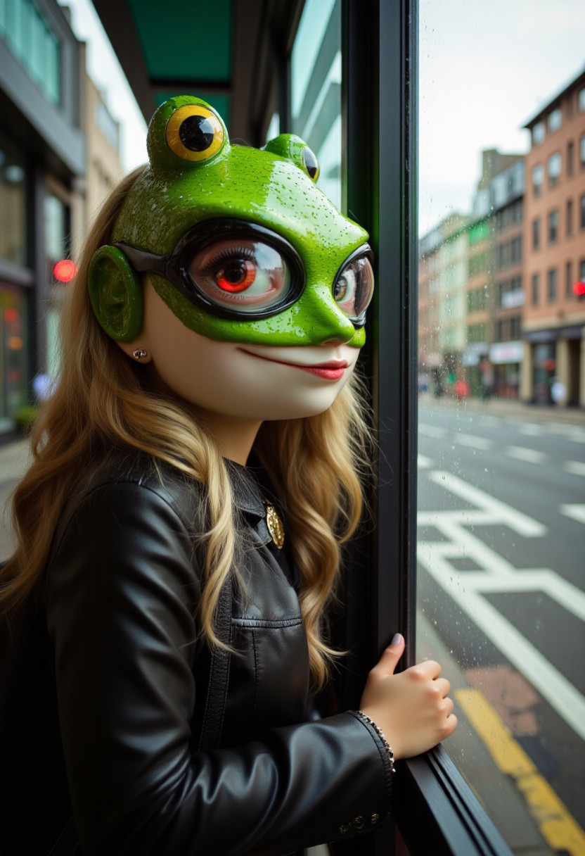 An anthro frog woman with frog face and frog eyes waiting for a bus at a bus stop. 16k, masterpiece.