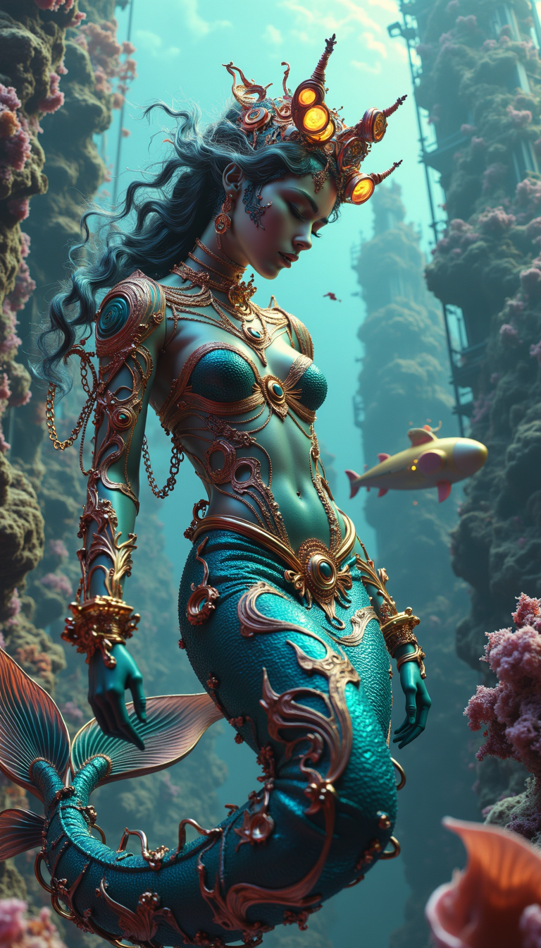 Steampunk mermaid queen ruling an underwater Victorian city, with clockwork fish and brass submarines navigating coral skyscrapers