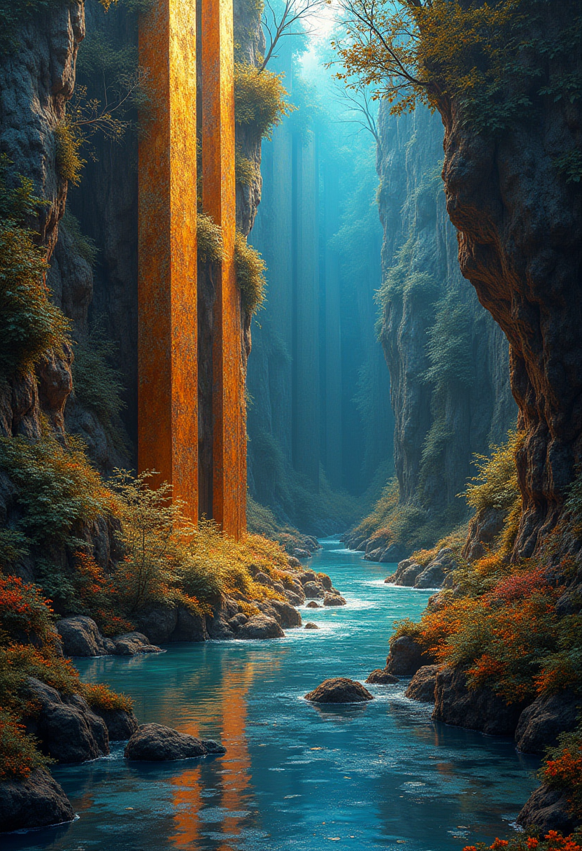 This breathtaking piece by Raqib Shaw showcases his signature style, combining textile art and painting. The foreground features an overgrown gold beam, while the background is a mix of sapphire and copper hues. Obsidian and technicolor elements add depth and contrast to the piece. The ethereal lighting illuminates the scene, casting dynamic shadows across the intricate textures and patterns. The reflective surfaces and the reflecting beams enhance the overall visual impact, drawing the viewer into the surreal world created by the artist. ,