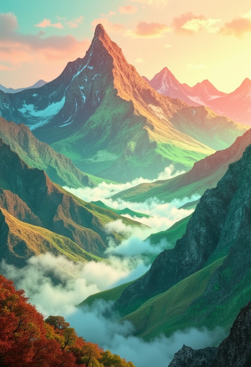 shenhai, liquid particles glowing, A majestic mountain range bathed in vermilion red and emerald green, its peaks fading into swirling clouds of soft peach blossom pink and delicate pale gold. The mountain trails are lined with flowing particles that rise like thin mist, dissolving into floating swirls of ink black as they touch the sky. Streams of amber light cascade down the cliffs, creating the illusion of liquid time. The trees on the slopes are painted in rich shades of jade, their leaves drifting like translucent particles, slowly evaporating into the air, leaving behind a sense of fleeting beauty.