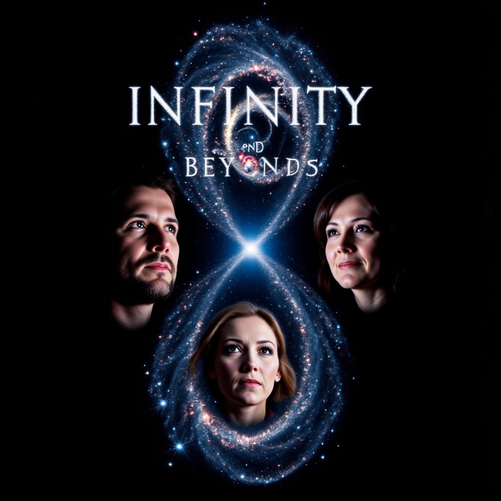 documentary film, text:"To Infinity and Beyond, random author title, vertical image of infinity symbol with starry outlines double image spiral galaxy in it, at left side is a close up face of man starring upwards in awe, on the right is a is a close up face of woman starring upwards in awe. their faces highlighted by the cosmos. james web space telescope,