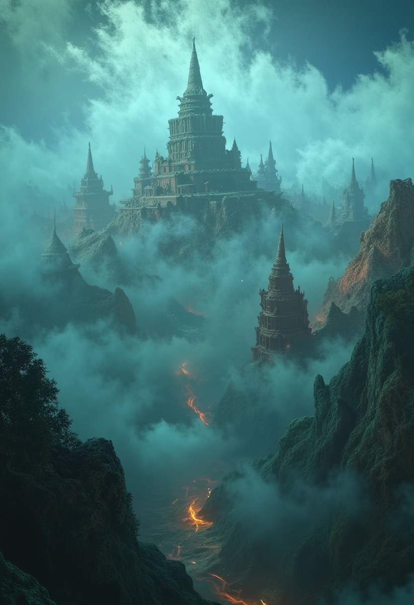 shenhai, liquid particles glowing, An ancient, forgotten city hidden within thick clouds of swirling mist and dust particles. The ruins of grand temples and palaces rise up through the fog, their outlines barely visible as the particles obscure much of the landscape. Occasionally, bursts of light from glowing particles illuminate parts of the city, revealing intricate stone carvings and decaying structures. The air is thick with mystery, as the constant movement of the mist creates an ever-changing, dreamlike atmosphere.